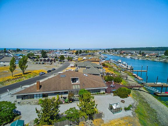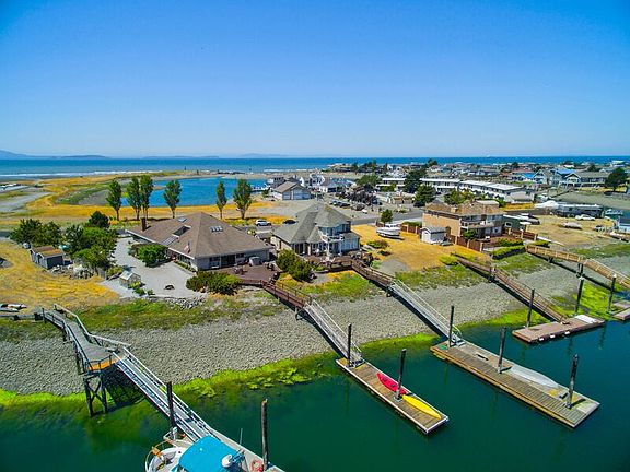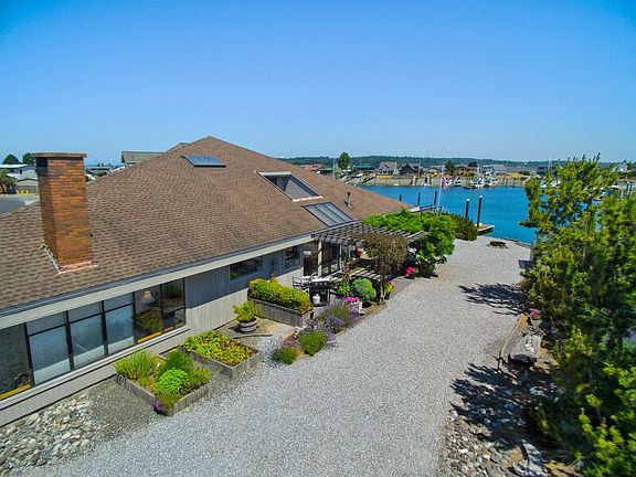 Architecturally intriguing custom home on the water, minutes from San Juan Islands! Go boating/fishing from 40 2-sided private boat dock. Natural light, dramatic wood lined living room w/ grand brick FP, Chefs kitchen:hardwood, granite, custom cabs, 3 ovens. Sky lit dining room, Mt Baker-Harbor view. 2 BDs up, Master Suite overlooks spectacular indoor exercise pool/spa, 2 BDs on main w/ private baths +den +office. 3 Decks, 2 Patios, low maint yard, 19,602 sf lot w RV prkg. A Waterfront Dream!