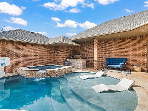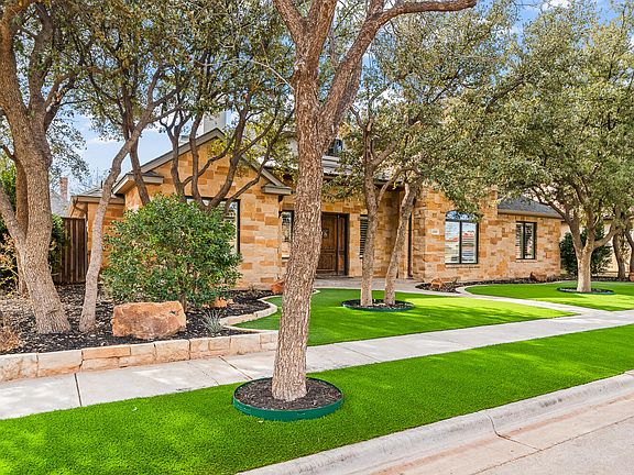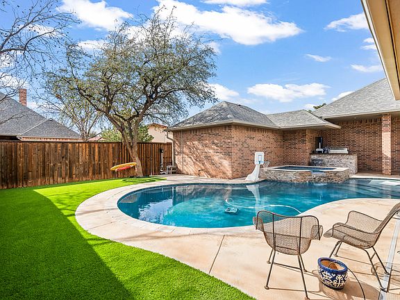 Gorgeous 4 bedroom 5.5 bath home situated in the coveted neighborhood of Orchard Park. You are welcomed to the property with a turf front yard and mature trees creating a captivating landscape. You enter into an oversized formal living room, complete with a high-beamed ceiling, natural light and a large stone fireplace. The entry space is complete with access to a formal dining room, perfect for entertaining or family gatherings. The kitchen flows seamlessly into the family room, creating an open, inviting atmosphere for relaxing or entertaining. The kitchen provides ample storage and an eating area while the adjacent family room boasts a fireplace, adding an extra layer of coziness to the space. The private owner's suite features a large walk-in closet, double vanities, soaking tub and walk-in shower. Each of the three additional bedrooms have their own en-suite bathrooms. The finished basement and third living area are perfect for movie nights or extra space for kids while the office provides the perfect place to get work from home done. Step outside to the peaceful back patio that showcases an outdoor fireplace, built in grilling/prep space, and low maintenance play area, all overlooking the pool and hot tub. Do not miss your chance to see this desirable home in the Lubbock-Cooper School District.