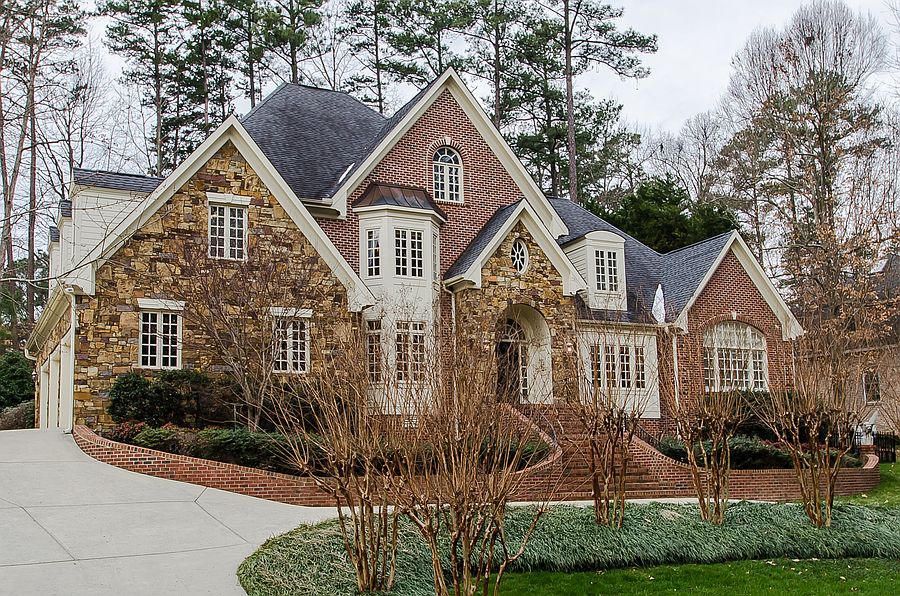 Custom executive stone/brick French country style home sits across from HOA owned wooded land and stream with view of beautiful neighborhood lake! Mahogany paneled library/study, 2-story family room with wall of windows overlooks the expansive deck and patio! Kitchen with granite, ss appliances, double ovens, island, tumbled marble backsplash and abundant cabinet space is open to the family room. HUGE main level master suite. Massive unfinished attic! Tankless water heater-less than 3 years new.