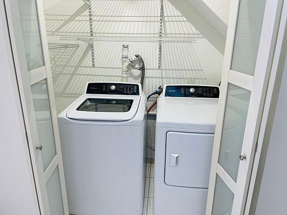 1 big bedroom, 1 bathroom with glass shower, living room, dinning room, kitchen with stainless steel appliances. Gas stove, tile floor. Laundry in the unit with washer and dryer and brand new Central A/C