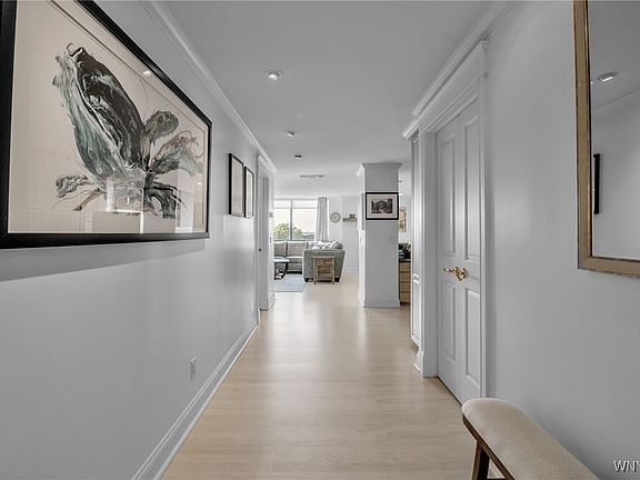 Stunning Admirals Walk condo in Buffalo’s Premier Waterfront Village. Moments from downtown and the revitalized harbor front. Breathtaking views of Buffalo Harbor, Lake Erie, & the Niagara River. This bright and airy home is the perfect place to enjoy luxurious living with nature’s beauty at your doorstep. Spacious foyer leads to open-concept living & dining area, featuring cozy fireplace, large windows & natural light. Gourmet kitchen with sleek stainless appliances, modern quartz countertops, and ample cabinetry. Primary suite complete with an updated en-suite bath and generous walk-in closet. Second bedroom has been thoughtfully reimagined by a previous owner, with a wall removed to create a versatile office/bedroom combo. The beautifully updated 2nd bathroom offers a relaxing soaking tub. Private screened-in patio, where you’ll enjoy spectacular water views and serene sunsets over the harbor. Convenient in-unit laundry. Secure building offers underground parking, exercise room, sauna, storage, and a welcoming lobby. Pets allowed with approval. Don't miss this rare opportunity to own a piece of waterfront paradise. Truly a must-see! Open Sunday, 2/9/25, between 11:00a and 1:00p.