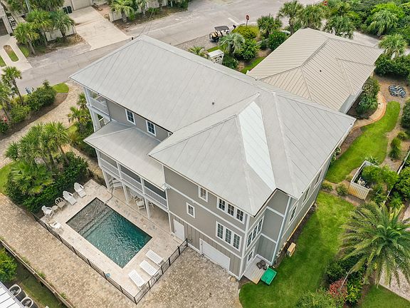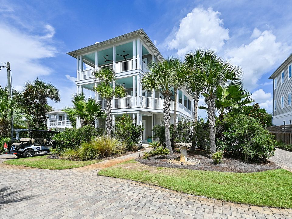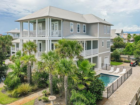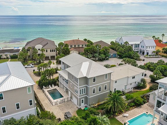 When location is all-important, this luxury beach house south of Scenic Highway 30A is hard to beat. Relax on the porch enjoying panoramic sunset views over the emerald Gulf of Mexico or head down to the beach just steps away and feel the soft sand between your toes. Previously rented as a beach retreat for up to 19 guests, this well-planned home boasts six spacious bedrooms, six-and-a-half baths and three living areas with ample room for everyone to find their own private space. A newly installed elevator whisks you effortlessly from floor to floor with spacious master en suites on all three levels. The first floor has a light-filled family room with ten-ft. pecky cypress ceilings, oak flooring and three sets of French windows opening onto the pool terrace. The main living room on the second floor has shiplap wall features and oak floors enhancing the light-filled open living space but it's the gulf views that steal the show. The dining area is a gathering place for card games and formal dining for eight with further seating at the breakfast. The adjoining gourmet kitchen is superbly equipped with floor-to-ceiling designer cabinets, pristine marble countertops and stainless steel appliances including an induction oven, ice maker and wine fridge. French doors open onto one of five balconies providing seamless outdoor living with stunning gulf views. Relax by the tranquil heated pool listening to the SONOS sound system and enjoy soft gulf breezes from the extended deck. The paved driveway has parking for seven vehicles as well as a climate-controlled garage. To crown it all, this desirable beach house is a short bicycle ride from upscale dining, shopping and entertainment at incredible communities including Seaside, Florida, and Grayton Beach.