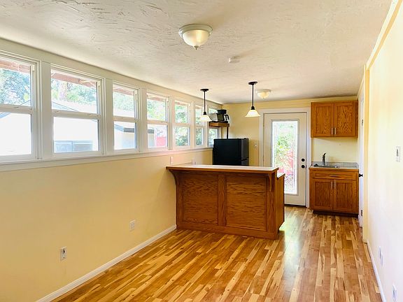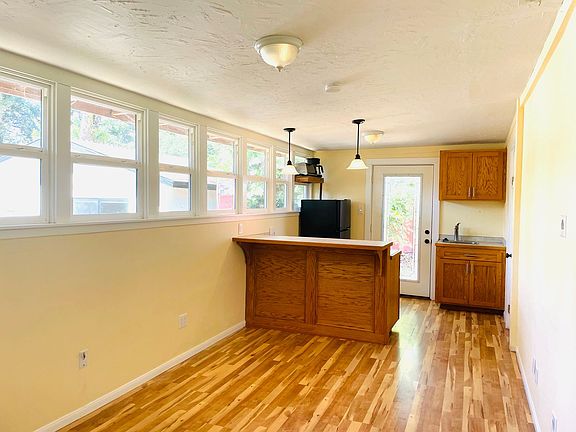 This attractive studio flat features laminated flooring throughout, a private entry, and a fenced-in yard with a cozy patio. The entryway leads into a bright and naturally lit living space. The kitchen offers tile countertops, wood cabinets and trim, and comes equipped with an electric plug-in stovetop, refrigerator, and complimentary washer/dryer.