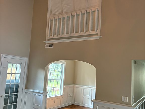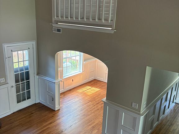 Open the front door to the open Livingroom with cathedral ceiling hardwood floors, newly painted. White woodwork, and fireplace.