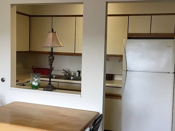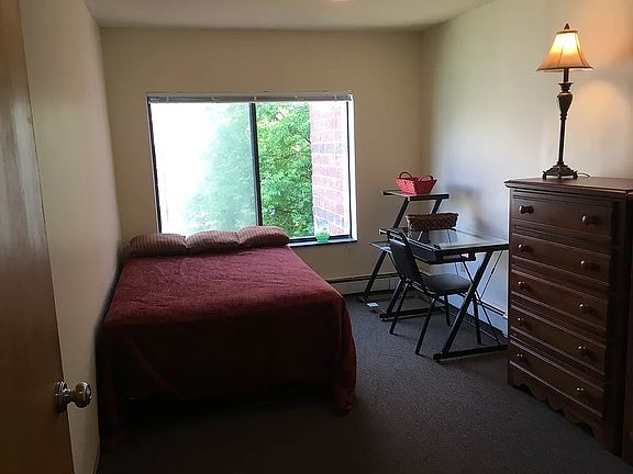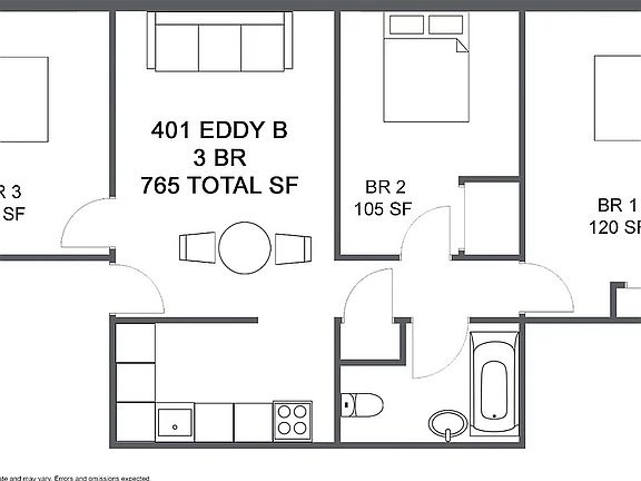 This is a three-bedroom apartment at 401 Eddy St. The living room has two couches and a coffee table. The kitchen has a pass-through window to the dining table set. The kitchen is equipped with ample counter space, several cabinets, and a microwave. Each bedroom has a double bed, a dresser, and a desk set. Every bedroom also has a large window which allows for plenty of natural light. There are three closets in this unit. The bathroom is large and includes a bathtub with mirrored shower doors. 24/7 recorded security camera suite from ADT.