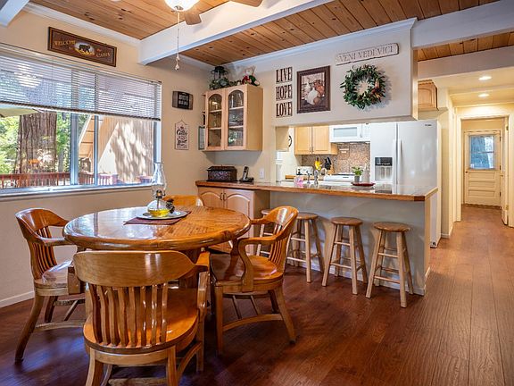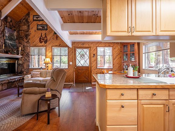 Charming custom-built and updated mountain retreat - perfect for full-time living, a second home, or a short-term rental! Offering 2 bedrooms on the main floor, one of which has been thoughtfully converted into a home office, this home combines functionality and charm. A full bathroom, spacious living room with cathedral ceilings, and stunning pecky cedar walls create an inviting atmosphere throughout. The kitchen and laundry areas are also located on the main floor, providing convenience and easy living. The living room is a standout, featuring a custom corner fireplace with a rock hearth, perfect for cozying up during the snowy winter months! Upstairs, you'll love the large loft area, which includes a third bedroom, sitting area, and a private balcony, offering a peaceful retreat. The second floor is also plumbed for a potential second bathroom, offering endless possibilities to expand. Central heating ensures comfort throughout the year. Outside, enjoy a large, level corner lot with easy access for year-round enjoyment. The property boasts a huge three-car garage with ample storage space in the garage as well as the attic space - there's even a half bathroom inside the garage! Additionally, there is a dedicated RV space complete with hookups, perfect for outdoor enthusiasts. The cabin comes mostly furnished and located just a short distance from the Big Trees Village Recreation Center, which offers 2 pools, tennis, pickleball, and bocce courts, along with picnic and playground areas. A must-see...don't miss the virtual tour!