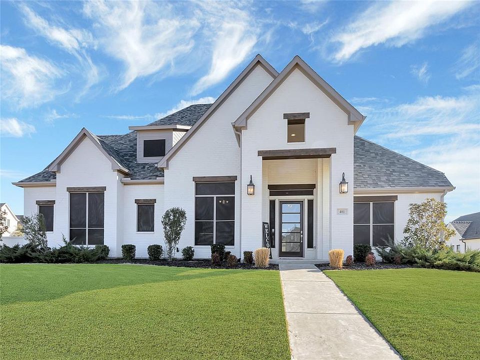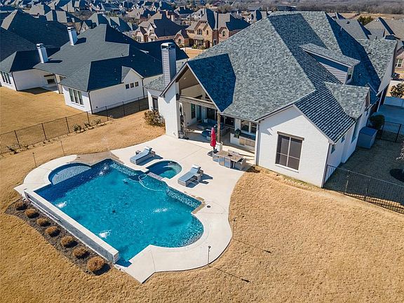 Modern Farmhouse Styling in Lucas excellent Lovejoy school district. Built 2017 by Owens Warford Custom Homes. Oversized corner lot, gorgeous curb appeal, extra large 3 car garage and every bedroom has en suite bath. Massive multi-panel sliding doors connect beautiful indoor living area with expansive private resort- covered patio, breathtaking pool-spa, outdoor kitchen, fireplaces inside and outeven Big Green Egg. Hand-scrapped wood floors, premium surfaces, stainless appliances, exposed beam ceiling and built-in shelving set the scene. Delightful designer touches like barn door, soaking tub, rainfall shower in master. Even energy efficient features like spray foam insulation. So much more, you must see it!