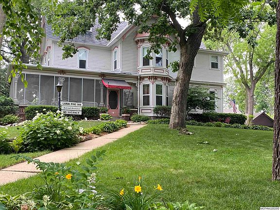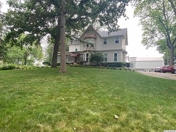 STATELY NINETEENTH-CENTURY VICTORIAN WITH SYMMETRICAL BAYS AND CHARMING WRAP AROUND PORCH in desirable resort town close to awesome lake, quaint downtown & historical Surf Ballroom. A successful Bed & Breakfast over the last 6 yrs. can be yours to continue same or as primary residence. Updated baths upstairs, with new plumbing & fixtures, new wiring & electrical service from Breaker box to attic for 2nd story and much of main level, new furnace in 2021, Insulation added in attic, new porch roof redone in 2022. Main house roof sheeting & shingles will be replaced in summer 2023. 3 Bedrooms with private baths up. Bedroom with private bath on main and a 3/4 bath off Den. Beautiful wood floors on main, spacious kitchen with tile floor, inviting front foyer, large dining room and living room parlor. Back porch leads the way to a tranquil back patio. Detached 32 wide x 24 long garage with 1 bedroom apt. balcony & deck, kitchenette w/gas range & refrigerator above.Only 3 blks to downtown.