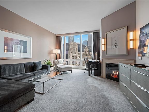 Luxurious one-bedroom, two-bath condo/hotel at Trump Hotel Chicago offering stunning east-facing views of Lake Michigan, the Chicago River, and the city skyline. This spacious condo/hotel features soaring 10' ceilings, floor-to-ceiling windows, abundant natural light, a cozy fireplace, and a full chef's kitchen. Designed with elegance and comfort in mind, the unit provides the perfect balance of style and functionality. Enjoy world-class amenities at 401 N. Wabash, including a full-service spa, indoor pool, health club, fine dining, bar, and 24-hour hotel services.