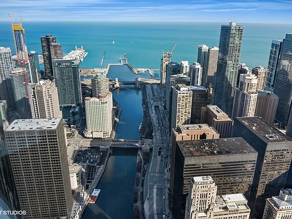 Experience luxury living in this elegant 1-bedroom, 1.5-bath residence perched high above the city with breathtaking southeast views spanning the Chicago River, Lake Michigan, and Millennium Park. Floor-to-ceiling windows, 9-foot ceilings, and rich hardwood flooring create a bright, sophisticated atmosphere. The chef's kitchen showcases Snaidero cabinetry, granite countertops, and top-of-the-line Wolf, Miele, and Sub-Zero appliances. Retreat to the spacious primary suite featuring a large walk-in closet and a spa-like bath with dual vanities, natural stone finishes, and a separate shower. Residents enjoy access to world-class amenities including a state-of-the-art spa and health club, indoor pool, 24-hour concierge and door staff, as well as on-site fine dining.