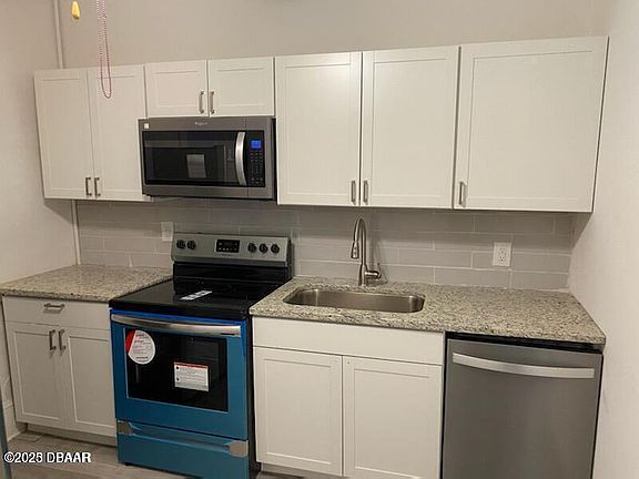 Electricity and water are included in the rent for this beautifully renovated beachside studio, located just two blocks from the ocean and close to Downtown Daytona Beach. The unit features freshly painted walls and ceilings, along with brand new laminate flooring throughout. The bathroom has been fully updated with a new shower stall, vanity, and toilet. The kitchen boasts new cabinetry, stainless steel appliances, granite countertops, and a stylish backsplash. Enjoy modern comfort and convenience in a prime coastal location, perfect for easy beachside living.