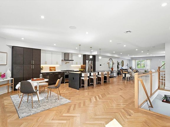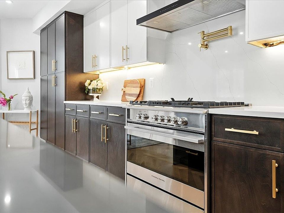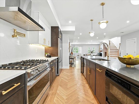 A masterclass in design, this treasured home showcases modern luxury through elements like herringbone oak floors, a statement staircase, a beautifully preserved exposed brick decorative fireplace, and impeccably curated light fixtures for effortless sophistication. The main level features a full-floor open-concept living area with eat-in kitchen and dining area. Finishes include contrasting mahogany cabinetry, brass fixtures including a pot-filler, high-end Fisher & Paykel appliances, and a waterfall black quartz island with contrasting white counters and backsplash.