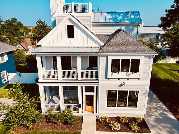 The third floor is designed for entertainment and relaxation, featuring a bunk room, an additional bedroom, bathroom, and a media room with a sink and beverage refrigerator. Stepping outside, you have a large composite deck with a spiral staircase leads up to the breathtaking rooftop deck, where a gas log fireplace sets the stage for stunning Lake Michigan sunsets.