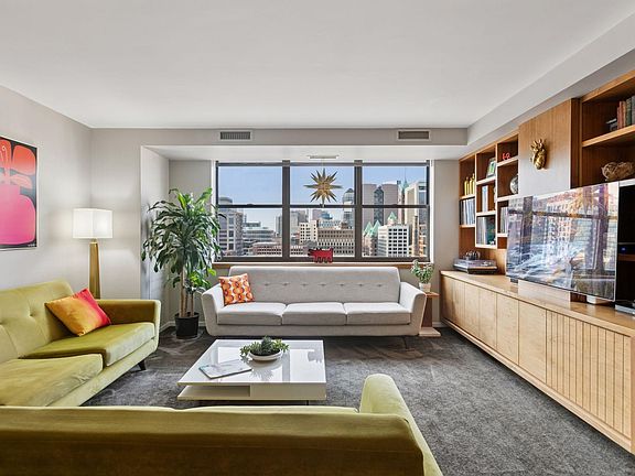 Thoughtful design meets modern convenience in this beautifully updated condo. The focal point of the living area is the custom-built walnut shelving and cabinetry, offering both elegance and ample storage with its premium soft-close doors.