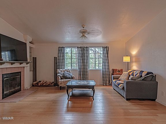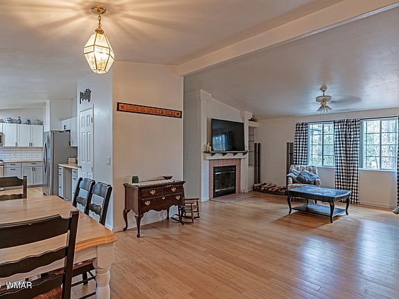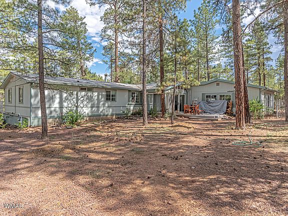 Nestled on 1.11 acres of tall Ponderosa Pines, this remodeled home offers peaceful mountain living with the conveniences of being in city limits. This 3 bedroom, 2 bath home features an open-concept floor plan with the family room and living room connected by a two sided fireplace. The kitchen, offers updated finishes and plenty of room for cooking and gathering. Attached is a two-car garage with a sink. And, a 30x60 RV garage, -with power, insulation, heating and concrete floor-is ideal to be used as a workshop or to plug in the RV! Step outside to a generous covered deck that faces the pines, perfect to enjoy the forest surroundings. AZ room has a pellet stove for cold mornings. Also comes with a back up generator and generator plug to power the main house in case of a power outage.