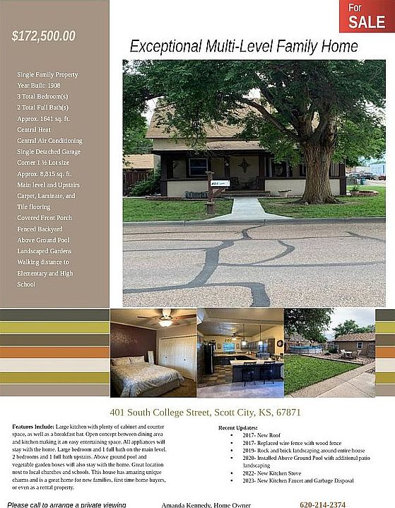 UPDATE: New window screens, stucco, storm door and roof coming soon!!! Come make your dreams come true in this charming, move-in ready home! Asking price is $149,900 with a $2,000 closing cost allowance. Lovely to look at...and delightful to live in! The long, cool front porch greets you as soon as you walk up to the front door! Lots of remodeling done and in mint condition! Carefully maintained and upgraded, it features old-style charm with all the latest conveniences. Open dining-room/kitchen area with tons of built in cabinets and all kitchen appliances included. Features two remodeled bathrooms, 3 bedrooms, nice walk-in laundryroom off the back door and storage basement. You'll love the private back yard, with a new wood fence, above ground pool and vegetable garden boxes. The generous sellers will leave all pool equipment and toys for the next owners to enjoy! Call Deb or Shorty at 620-872-5267 for your private showing on this delightful home at 401 S. College, Scott City, Ks.