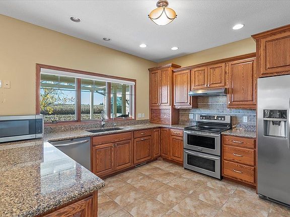 This beautiful, sprawling ranch on the south end of La Porte City can now be yours! Quality craftsmanship and proud ownership is evident as you walk through this 5 bedroom, 4 bathroom home. As you enter through the front door you'll notice the breathtaking farmland views outside the large living room windows, quality hardwood floors and a stone gas fireplace surrounded by built-ins. The kitchen features quartz countertops, tile floor, a large walk-in pantry, stainless steel appliances (included), a breakfast bar, and a large window looking out to the fields behind. Other main-level highlights include a laundry room (washer & dryer included), two primary suites with attached 3/4 bathrooms and walk-in closets, two additional bedrooms, a full guest bathroom, custom motorized blinds, and zero-entry access from the garage! Downstairs there is a large finished living room, an additional bedroom, full bathroom, and an enormous storage room. The backyard features a covered patio with attached gas grill and great views of the fields. Also included is a wired full-home generator. And to top it off a large, insulated & heated workshop was added in 2020 to the back of the 3 stall garage! So much to offer here! Schedule your showing today!