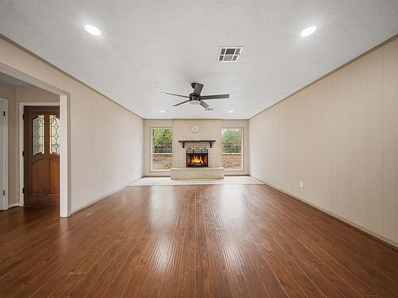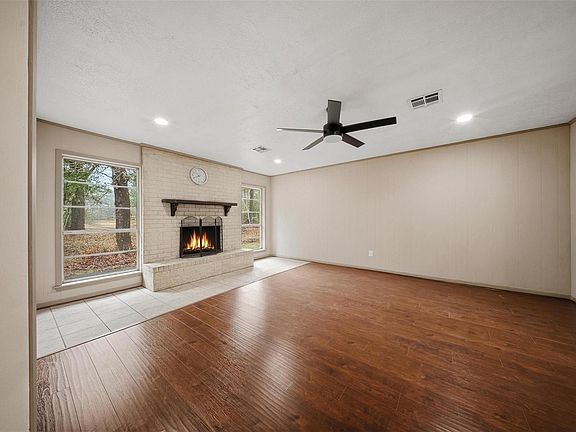 Nestled on approximately one acre in a peaceful, wooded country setting, this charming single-story brick home offers comfort, space, and privacy, making it the perfect family home. The inviting living room features a cozy wood-burning fireplace, creating an ideal gathering place on cool evenings. The home sits within a partially fenced yard with additional open land beyond, offering plenty of room to play, relax, or entertain. Exterior features include a composition roof, slab foundation, attached one-car garage, additional covered parking under a detached carport, and a rear storage or workshop building. Enjoy the tranquility of country living while remaining just a short drive from the conveniences of Livingston.