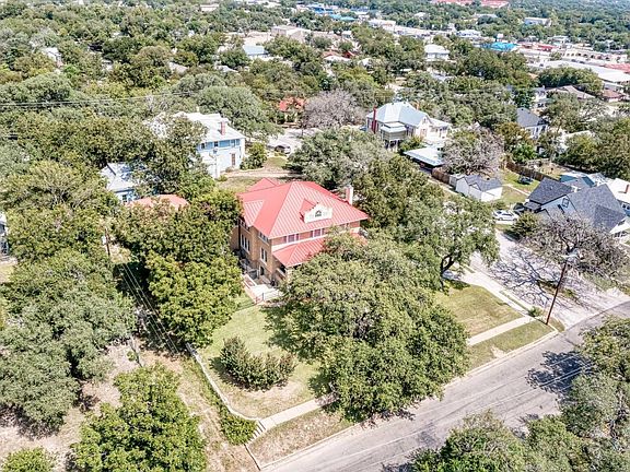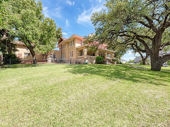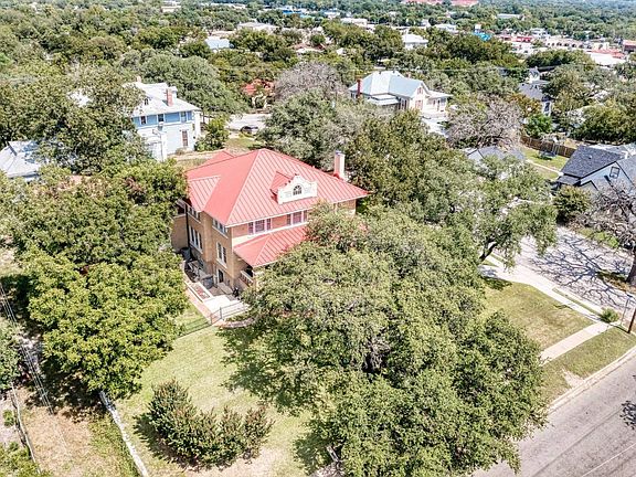 Situated on a prominent corner lot and framed by majestic heritage oaks, this exquisite and unique 1920 Craftsman-era residence is a standout among Lampasas' historical homes. The home has been meticulously and proudly restored, a true testament to luxurious living with its perfect blend of comfort and elegance. Spanning 4,140 square feet, the main level welcomes you into a stunning foyer defined by rich, walnut-toned walls, coffered ceilings, a grand staircase, and elegant light fixtures. A sophisticated library with a fireplace is to your right, with a formal dining room to your left. The fully remodeled and updated kitchen is the heart of the home, featuring stainless steel appliances, granite countertops, and a fully restored and operational Chambers gas range. A sunroom and pantry extend from the kitchen, which also adjoins a cozy sitting room. The first floor includes one bedroom and one and a half bathrooms, while the unique double staircase leads to the second level, which houses four bedrooms and three full bathrooms. Unlike most historical homes, this property's 720 Sq ft basement is fully functional and well-lit, making it an ideal space for a hobbyist, wine collection, personal gym or game room. Additional lodging includes a 460-square-foot guest apartment located above the enclosed garage, providing a comfortable & charming space for visitors, complete with a full kitchen, full restroom, and plenty of natural light. The oversized patios, verandas, and covered porches further contribute to the home's remarkable character and appeal. Imagine yourself owning this impressive estate. Homes such as this are a rare find.