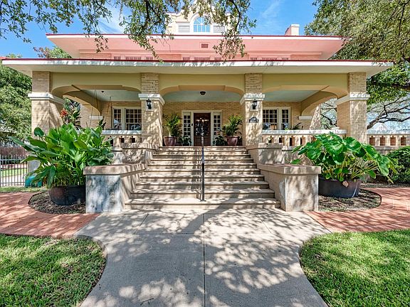 Situated on a prominent corner lot and framed by majestic heritage oaks, this exquisite and unique 1920 Craftsman-era residence is a standout among Lampasas' historical homes. The home has been meticulously and proudly restored, a true testament to luxurious living with its perfect blend of comfort and elegance. Spanning 4,140 square feet, the main level welcomes you into a stunning foyer defined by rich, walnut-toned walls, coffered ceilings, a grand staircase, and elegant light fixtures. A sophisticated library with a fireplace is to your right, with a formal dining room to your left. The fully remodeled and updated kitchen is the heart of the home, featuring stainless steel appliances, granite countertops, and a fully restored and operational Chambers gas range. A sunroom and pantry extend from the kitchen, which also adjoins a cozy sitting room. The first floor includes one bedroom and one and a half bathrooms, while the unique double staircase leads to the second level, which houses four bedrooms and three full bathrooms. Unlike most historical homes, this property's 720 Sq ft basement is fully functional and well-lit, making it an ideal space for a hobbyist, wine collection, personal gym or game room. Additional lodging includes a 400-square-foot guest apartment located above the enclosed garage, providing a comfortable & charming space for visitors, complete with a full kitchen, full restroom, and plenty of natural light. The oversized patios, verandas, and covered porches further contribute to the home's remarkable character and appeal. Imagine yourself owning this impressive estate. Homes such as this are a rare find.