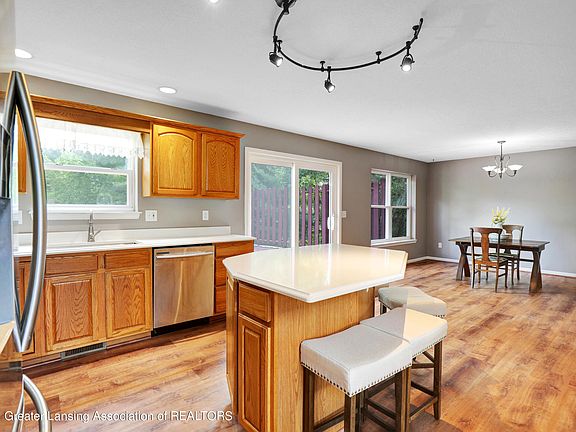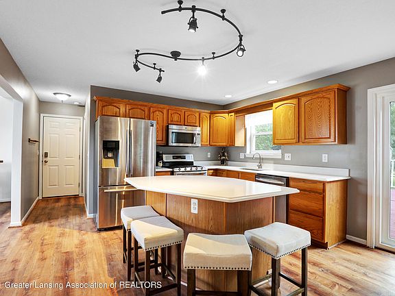 Welcome to 401 W. Rolfe, in beautiful Perry Lakes. Rare . 66 acre city lot in Perry Lakes Estates, 1/2 block to waterfront and lake access. Upstairs has 3 bedrooms with 2 full en-suite bathrooms with a balcony overlooking the Cathedral living room, the 4th bedroom and 3rd full bath are on the main floor with a 1st floor laundry. New plank flooring and wall paint across the living, dining and kitchen area. Large Kitchen Island, new Quartz countertops, new Stainless steel sink and Energy Star Stainless Steel Appliances are ready for you ! The always dry basement has a separate workshop with 12 feet of bench and 24 feet of shelving. The Furnace, Central Air Conditioner and Hot water heater are all less than 2 years old. The sliding door onto the large deck overlooks one of the largest private backyards in the City of Perry, wired for a future hot tub or generator, with shade trees inside a 100ft x 65ft fenced in area. Attached 2 car garage has brand new oversized overhead door.