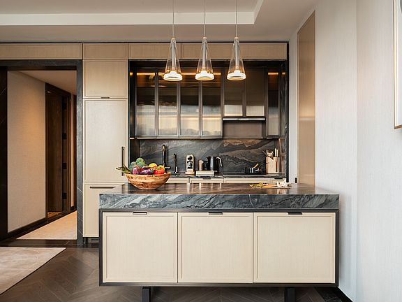 Designed by visionary Thomas Juul-Hansen, this haven features Giorgetti furnishings that whisper Italian craftsmanship and bespoke toiletries by Officine Universelle Buly 1803 for a touch of Parisian luxury. As night falls, custom Alabaster light fixtures by Alain Ellouz cast a warm glow, transforming your living space into an intimate retreat.