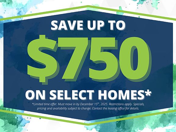 - Special offer! Save up to $750 on select homes! *Limited time offer. Restrictions apply. Specials, pricing and availability subject to change daily. Contact the leasing office for details.