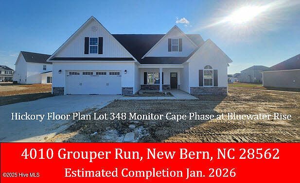 The ''Hickory'' floor plan is nearing completion in the Monitor Cape phase of Bluewater Rise. $10,000 buyer's closing incentive w/ use of preferred lender & closing attorney. Features 3 Bedrooms / 3 Baths w/ most of your square footage on the 1st floor. An additional bonus room upstairs with it's own full bath and closet can be a 4th bedroom. Great Room with vaulted ceiling and gas fireplace. Master Bedroom has tray ceiling. Other features include an eat in kitchen w/ granite counter tops plus a formal dining room, covered back porch. Convenient commute to both MCAS Cherry Point & downtown New Bern.