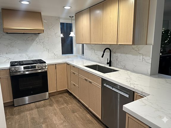 -Remodeled Modern kitchen in the summer of 2025 with brand new stainless steel appliances & a pool-view to watch the kids splash or your favorite show on the tv while you cook!