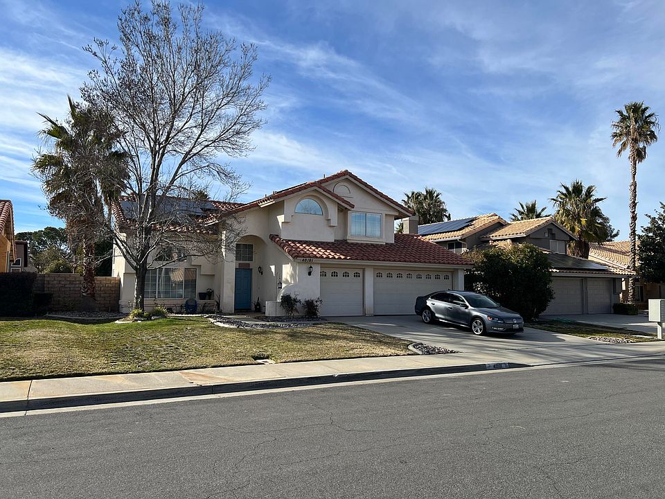 This Beautiful Rancho Vista Pool Home is located in the Montera tract in West Palmdale and has 4-bedroom 2.5 bath *2083 sqft with dark wood tile flooring - high ceilings - formal dining room and a family room w/fireplace. The kitchen has stainless appliances-granite counter tops. The kitchen opens up to the family room w/fireplace. Has extra wide stairway w/ dark wood railing there is 4 upstairs bedrooms a large master bedroom with master bath and custom shower. ceiling fans, separate laundry room. 3 car garage with pull thru. The backyard has a covered patio - fire pit and a beautiful in-ground pool & spa - block walls surrounding the entire yard, walking distance to parks and shopping center - close to mall and freeway.