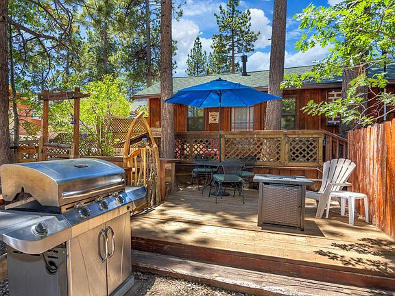 Motivated seller! Your search is over. This charming vintage cabin is ''Simply Irresistible''. Originally built in 1932, tastefully updated with modern amenities, delightful rustic touches and artistic details throughout. Beautiful slate floors, T&G walls, ceilings, and reclaimed wood features. Thoughtful use of the interior space makes for a cozy and comfy living room with an efficient gas-log stove and dining area, and has an adjacent office/study nook. Adorable kitchen has pendant lighting, breakfast bar, and is open to the living room. Remodeled bathroom with impressive slate shower and custom sliding barn door and vanity. Spacious bedroom opens to private patio. Enjoy outdoor mountain living out on multi-tiered deck and patio space surrounding the cabin. Gaze at the stars while soaking in the spa. Smart home features include: wi-fi thermostat w/battery backup, electronic front door lock, automatic lights/camera, plus EV charger. Even has laundry! Situated on a well-treed corner lot in a prime central Big Bear Lake location with easy all-season access and so close to the Village, lake, and forest trails. **NEW BLACKTOP DRIVEWAY** Has been a highly successful vacation rental. Go take a look ~ you'll fall in love.