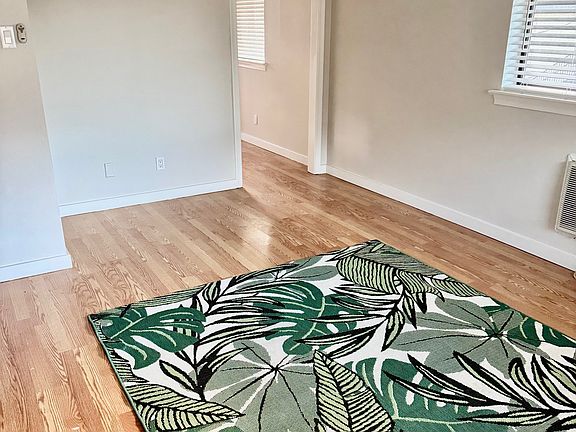 Interior highlights include hardwood, tile, and laminate flooring throughout (no carpet) along with a spacious kitchen and living room that comfortably accommodate a dining table. A private rear staircase provides a separate entrance, and an assigned, covered parking space is included.