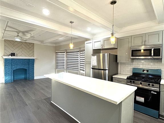 Step inside to a spacious living room with a cozy fireplace, flowing seamlessly into a formal dining room and a chef's kitchen featuring a large island, new white Corian countertops, custom tile accent wall, new cabinets, and stainless-steel appliances (microwave, stove, and refrigerator) and washer and dryer. Additional upgrades include/New hardwood floors throughout/Fresh interior & exterior paint/New copper plumbing