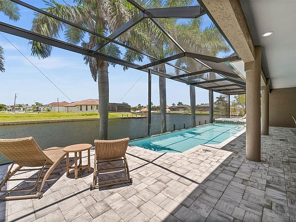 Welcome to 4012 SW 29th Ave, an updated Gulf Access pool home on a quiet cul-de-sac in Cape Coral’s Surfside neighborhood. This oversized lot features 112 feet of waterfront with intersecting canal views and western exposure. Remodeled inside and out with a new metal roof, picture window pool cage, paver deck, new flooring, and a stunning kitchen with Café appliances and butler’s pantry. The open great room leads to a large lanai with a 38' heated pool and spa. The primary suite has French doors to the lanai and a spa-like bath. Upstairs, a loft with bath and balcony offers flexible space. Impact windows, tall ceilings, and elegant finishes throughout. One bridge and no lock to open water!