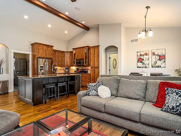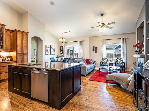Immaculate home in Saddle Ridge. 5 bed 3 bath 3 car garage. Tastefully painted throughout. Huge yard with stone fireplace, stamped patio, and 192sq ft shed. Parade home with several features. Gorgeous two-tone stained kitchen. Nice wet-bar overlooking large family room in basement. Granite counters throughout. Built-in surround sound, intercom, and wifi extender. High efficiency furnace and instant hot water keeps utility bills low. New Class 4 roof and gutters. Unlike any other in Saddle Ridge!
