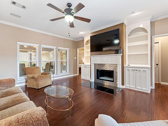 Welcome to this beautifully updated 3-bedroom, 2-bathroom home with an office/flex space, offering 1,911 square feet of thoughtfully designed living space. The open floor plan seamlessly connects the living room, dining area, and kitchen, creating the perfect space for entertaining or family gatherings. The living room is a true centerpiece, featuring wood floors, a wall of windows overlooking the screened back patio, a tiled fireplace, and built-in shelving for added functionality and style. The kitchen is a chef’s dream with granite countertops, a farmhouse-style stainless steel sink, a tiled backsplash, a new microwave, and under-cabinet lighting that highlights its beauty. Retreat to the spacious master suite, which is privately situated apart from the other bedrooms. The luxurious master bathroom boasts a freestanding soaking tub, a separate walk-in shower, and granite countertops. Outdoor living shines with a fully screened-in back porch, perfect for relaxing. Additional upgrades include a 3-year-old roof and a 4-year-old HVAC system, providing added peace of mind. The two-car garage is equipped with built-in shelving, offering ample storage space. Tucked away in a quiet one-street subdivision, this home offers a prime location just minutes from I-12, with convenient access to restaurants, shopping, grocery stores, and more. With its beautiful updates, open layout, and attention to detail, this home is move-in ready and waiting for you!