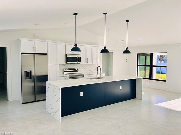 Finishing last touches on this BANK OWNED NEW CONSTRUCTION HOME in a quiet area of NE Cape Coral. This single family home offers 4 bedrooms, 3 bathrooms, large covered lanai and beautiful entry with concrete walkway. Property is very close to Island Coast High School and Gator Trails Park. Just west of 41 ( Tamiami Trail ) with easy access to I-75 and Del Prado Blvd. Home has quartz countertops, kitchen island with waterfall edge, tile in the whole home even in the lanai and front entry. Beautiful modern design with extra touches as quartz backsplash and dark blue cabinets in the kitchen island are one of the few that will catch your eye. Impact windows and doors. CO is expected in the next couple of weeks.