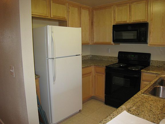 Upgraded granite counter top and beautiful wood floor. The kitchen appliances comes with electric stove, oven, refrigerator and microwave hood vent. Garbage disposal in sink. Spacious dining area just off the kitchen. Condo has high ceiling which gives a bright and airy feel. Air conditioner and wall heating. Sliding glass doors open to a private patio. Shared laundry available on site in common area. 2 assigned parking spaces Owner pays for water, renters responsible for electric, cable and internet.