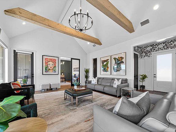 Looking for a captivating, modern design with gorgeous textures and a fabulous floor plan? This 2024 Parade of Homes, single story property, has all the design elements a buyer could want! Vaulted ceilings, custom lighting, beautiful flooring and stunning windows make this open concept home come to life! Wonderful kitchen, with no detail missed, offers custom cabinetry, large breakfast bar that doubles as an island, drop in range that is plumbed for gas or can remain electric, ample storage and walk in panty! Split primary is a fabulous escape with soaring ceilings, large walk in closet with his/her built ins and luxurious primary bath boasting large freestanding bath, gorgeous tiled shower and his/her vanities! Three additional guest bedrooms are each oversized with walk in closets! One bedroom has direct access to private bath while the two additional bedrooms share a large jack-n-jill bath! Secondary living space could serve multiple functions as a play room, office or more entertaining space! Step outside to the large covered patio and spacious fenced yard! This corner lot home sits on a quiet cul-de-sac inside Oak Creek! With direct access to Tyler Racquet Club, the new owners can enjoy swimming, tennis, workouts, pickle-ball and the cafe! Sellers installed $13K worth of custom, motorized shades throughout the property and added soffit outlets to the exterior! Don't miss this designers dream, priced competitively and ready for new owners!