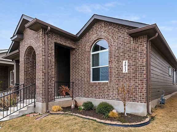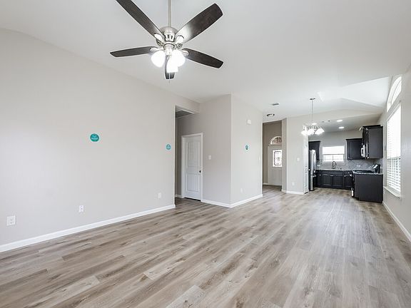 With a rear-loading garage, fenced yard, and renovated interior, this San Marcos, Texas rental home has a ton of great features, along with its three bedrooms and two bathrooms within 1,247 square feet of space. The single-story layout starts with stylish wood-look vinyl plank flooring in the living room, which has neutral gray walls and a glass door leading outside. A dining area with a big window and chandelier flows into the kitchen, which is a home cook's dream with stainless steel appliances, stylish granite countertops, and dark wooden cabinetry. There's an arched window, a ceiling fan, and a walk-in closet in the primary suite, along with an extra-long vanity and a walk-in shower in the en-suite bathroom. Come tour this rental home today!