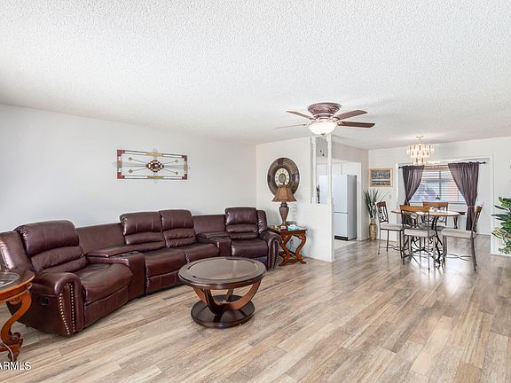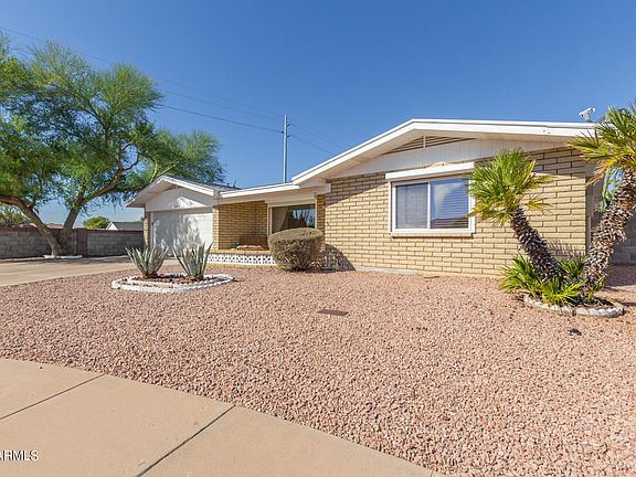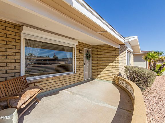 Adorable home in Sunland Village, a 55+ Community. This 2 bed, 2 bath large home with a N/S exposure is nestled on a private cul-de-sac. HVAC unit replaced just a few months ago. A 2-car garage, low-care landscape, and a cozy porch welcome you. Home features security shutters on all windows. Inside, the perfectly flowing open layout features a bright and welcoming living room, updated beautiful wood-look flooring, neutral paint. Immaculate kitchen boasts white cabinets, built-in appliances, ample counter space, & tile backsplash. Large laundry room w/utility sink and cabinets! Continue to the relaxing backyard showcasing a covered patio, new stone pavers for extended seating, & a no-care desert landscape. Sunland Village offers lots of activities and amenities.