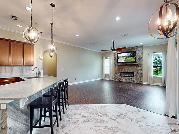 PRICE REDUCTION $40,000 !!! INSTANT EQUITY, $523000 appraisal on hand !! Welcome home to this 4 bedroom 3 bath home on a quiet street ! Gourmet kitchen features all stainless appliances, including double wall ovens, 42'' upper cabinets, quartz countertops and tiled backsplash . Home has very large bedrooms with split floor plan. Formal LR and DR. Tile, wood and carpet in the home. Primary suite has walk in large closet and separate sitting area for reading or workspace. Primary bath has huge shower and claw foot tub for soaking !! 2nd bedroom has en suite as well !! Home is on a pond with fenced in back yard. Screened lanai overlooks the pond, very pretty view !! Updated lighting and wood blinds throughout. White vinyl windows . Inside laundry room with barn door entry !! Mounted 65'' TV in LR conveys !! Samsung washer and dryer convey. Electric fireplace in primary bedroom and living room . Gorgeous tumbled stone wall in LR. Home is very close to the amenity center where you'll find, tennis courts, jogging trail, kids play ground, community pool and fitness center. Vinyl and tiled floors , Carpet in bedrooms !!
