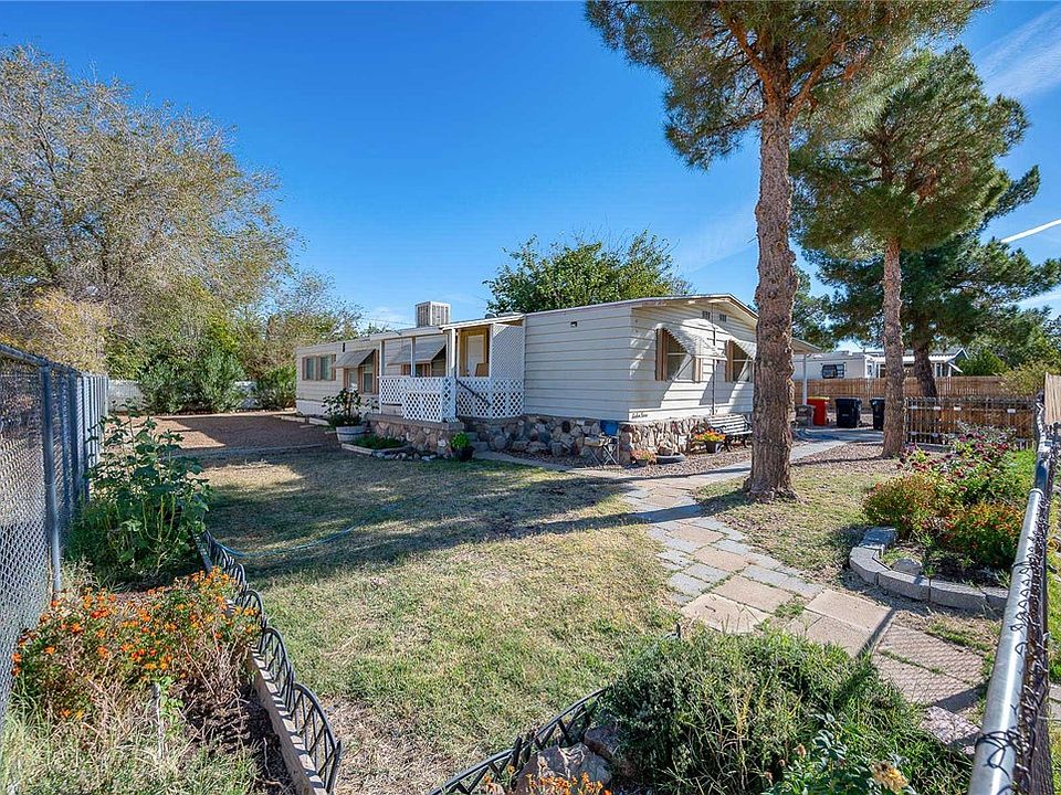 Clean and move-in ready 3 bedroom 2 bath doublewide on a spacious double lot with mature shade trees. Covered carport with plenty of parking on the paved driveway. Open floor plan with living room, family room, and dining area. The enclosed patio with French door entry gives you a bonus family room perfect for Arizona evenings. Garden area ready for your vegetables or flowers. Storage shed for all your extras. Central air conditioning keeps you cool all summer. Big open yard space with tons of potential for outdoor living.