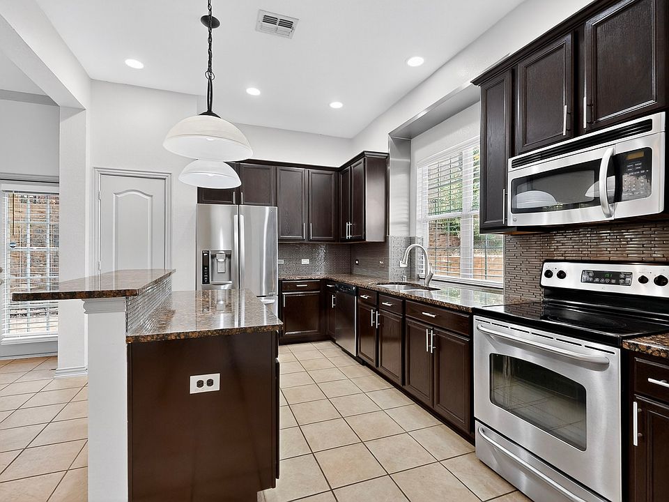 Open floor planStainless steel appliancesDesk areaGranite countertopsLarge primary bedroomTray ceilingEntertaining eat-in island