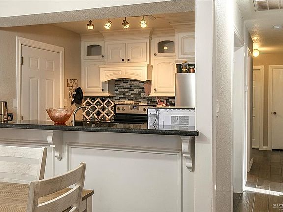 Darling 3 bedroom 2 bath home located in North Weslaco. The home was built in 2000 and is finished with wood like tile flooring throughout. The kitchen is open to the dining and living areas. Fresh white cabinets are contrast to the black granite, glass tiles backsplash, and stainless appliances. The extra detailing on the wood work gives the kitchen more of a custom look. Both bathrooms have tub/shower combo. A nice sized backyard is fenced and has a storage shed. There is a small wood deck on the side of the home.