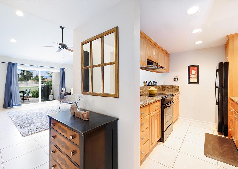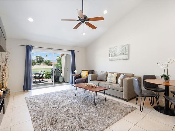 Remodeled 2 bedroom/2 bath condo located in Palm Desert Resort Country Club - renowned for pickle ball, tennis, golf, and clubhouse activities. Updated features include granite countertops and cabinetry in kitchen and both bathrooms, newer lighting throughout, and large ceramic tiles. The kitchen opens to the living area and offers countertop seating. Newer sliding door opens to the tiled back patio with 180 degrees of golf course and peek-a-boo mountain views. The primary bedroom features golf course views and sliding doors to the back patio. One of several community pools conveniently located across the street. Guest bedroom features an ensuite guest bath. Offered fully furnished. Palm Desert Resort Country Club is located mid-valley with easy I-10 access, dining, and within minutes of the famous Acrisure Arena. The condo has been used as a rental with income/expense history provided upon request. Short term rentals are allowed.