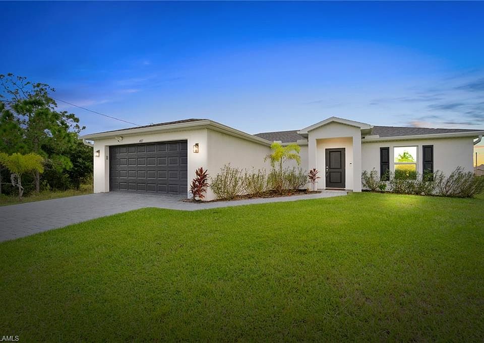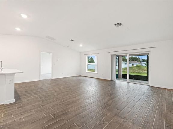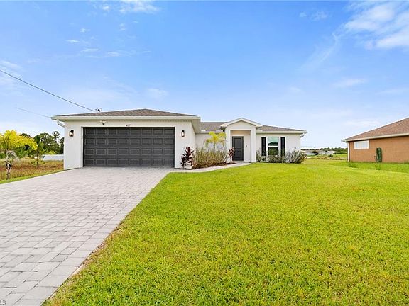 Move In Ready!! Welcome to your dream home in the heart of Lehigh Acres! This stunning Newly-Built house, completed in 2023, offers a perfect blend of modern design and functionality. Boasting 1,400 square feet of living space, this home features an open floor plan that seamlessly connects the kitchen, dining, and living areas, providing ample space for entertaining or relaxing. The kitchen is a chef’s delight, complete with elegant white shaker cabinets, pristine quartz countertops, and GE kitchen appliances. The split floor plan ensures privacy, with the owner’s suite offering a luxurious retreat. It includes dual vanity sinks, sleek quartz countertops, and a spacious walk-in closet. The guest bathroom is conveniently designed with a tub/shower combo. The home features tile floors throughout the main areas, with cozy carpeted bedrooms for added comfort. Enjoy the Florida lifestyle with a screened-in rear patio, perfect for morning coffees or evening gatherings. The property is equipped with impact windows and doors, ensuring safety and energy efficiency. Additional conveniences include a two-car garage, an in-residence washer and dryer, and a built-in irrigation system to maintain your lawns’ beauty. Located just a short drive from State Route 82 and Daniels Parkway, this home offers easy access to the Southwest Florida International Airport and I-75, making commuting a breeze. This is an ideal location for those seeking a balance of tranquility and connectivity. Immaculate and move-in ready, this house truly shows like a model home. Home still has about 9 years left on the builders warranty. Don’t miss out on this exceptional opportunity!