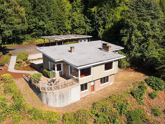 Secluded In-city retreat w/treasured western sun exposure & sweeping powerful views of Sound & Mtns. 1st time on the market for this mid-century modern home with over ½ acre of park like grounds. Main level w/kitchen & eating space. Living room boasts large windows to frame the view, fireplace & entrance to the deck overlooking the Sound. 2 bdrms & full bath finish this floor. Lower level: family room w/fireplace, 2 more bdrms & Utility Rm. 700 SF carport w/storage. A true Zen oasis!