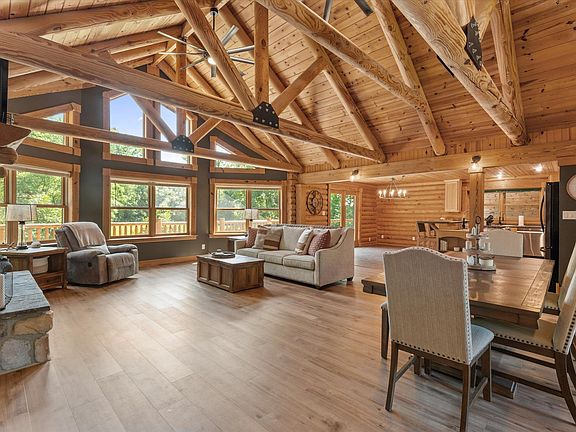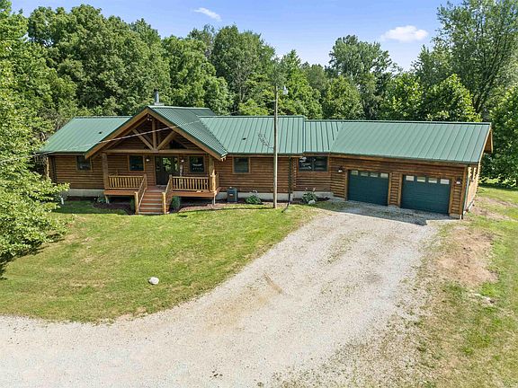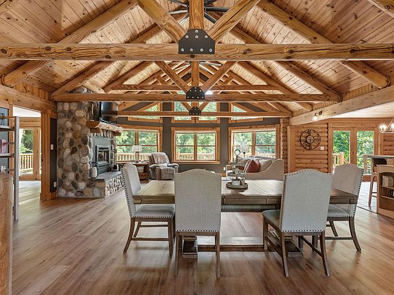 Here is your chance to own a well-maintained log cabin nestled off the road. As you drive up the driveway you begin to be in your own nature oasis on 7 acres, partial wooded, partial cleared. There is already a chicken coop and garden area to start your own homestead. As you walk into the living room you see cathedral ceilings with beautiful wood beams that are lit up by all the natural light coming through the large windows. The living room is open to the kitchen which makes this a great kitchen to host in and enjoy with all your loved ones. The kitchen offers 2 sinks, a new dishwasher, new gas range and a breakfast bar. The beautiful stone wood burning fireplace in the living room brings peace and comfort to relax in the winter and the 3-season room that leads out to the large deck brings all the fresh air to relax in our warmer months. Nature views are out every window of this home including the basement which also brings in an abundance of natural light. The 3 bedrooms are large, and 2 bedrooms offer walk in closets. The primary suite has its own french doors leading out to that large deck, a bathroom with 2 sinks, a toilet room, garden tub, shower, and new flooring. The flooring in the basement is heated by electricity. There is new HVAC, new flooring in the living room, primary bathroom, and all bedrooms. This home is truly a gem.