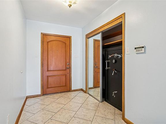 Additional highlights include a foyer closet with a built-in safe, an attached garage with enclosed workshop, and a second driveway with fenced-in covered parking ideal for an extra vehicle or small boat.